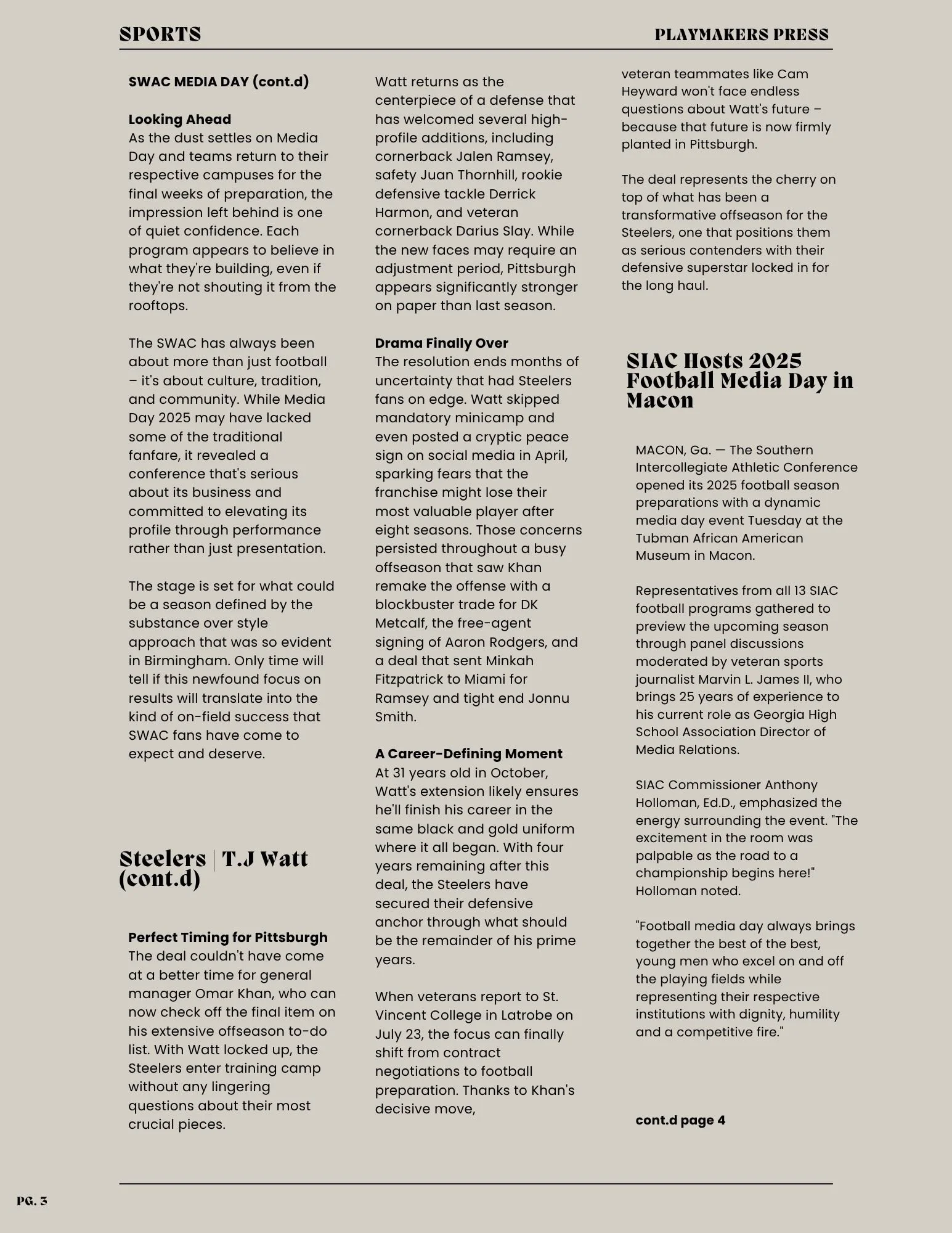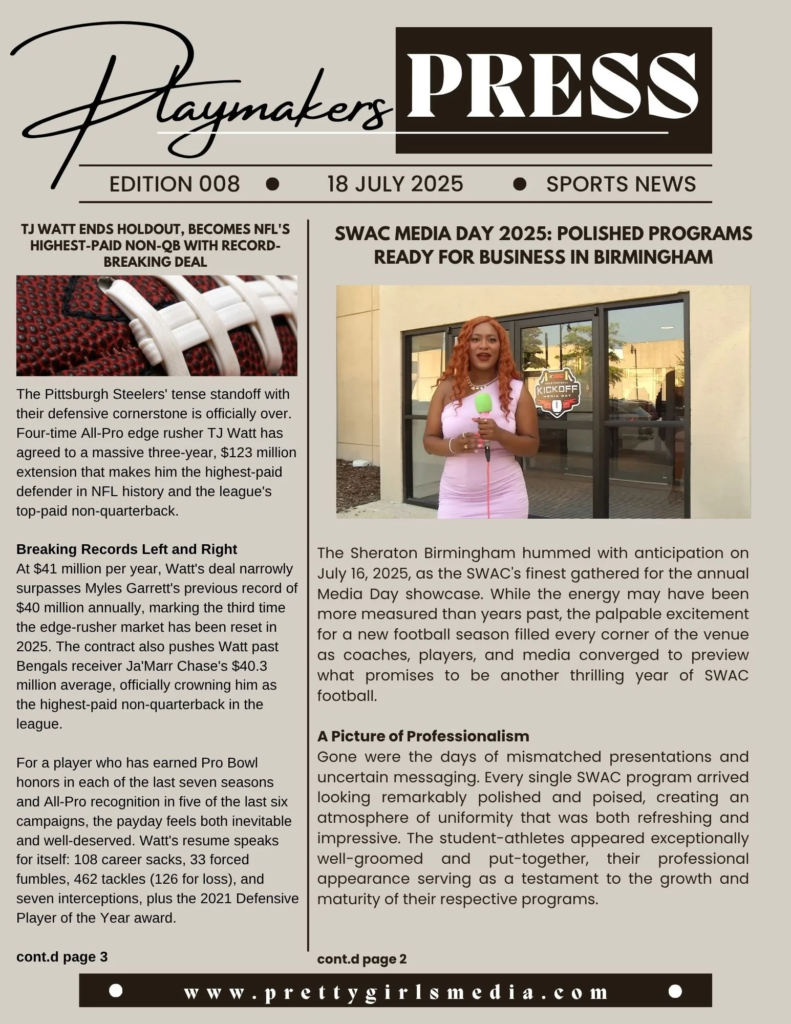 The Playmakers Press, Ed. 8 NFLWomen's BasketballSports InformationHBCU FootballCollege Football Jul 18 Written By Dez Barnes Playmakers PressNFLPittsburgh SteelersTJ WATTSWACBlack College FootballHBCU FOOTBALLCollege FootballSIACMedia DayWNBACaitlin Clark Dez Barnes
